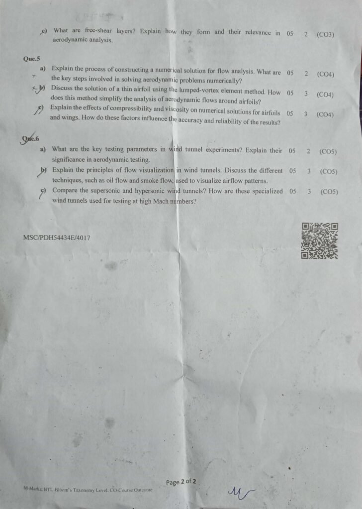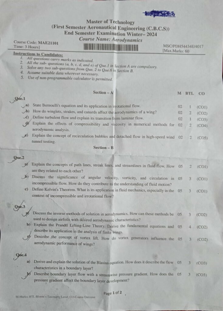 Aerodynamics (MAE21101) M.Tech Aeronautical Engineering question paper. वायुगतिकी (Aerodynamics, MAE21101) तकनीकी स्नातकोत्तर (M.Tech) वैमानिक अभियांत्रिकी परीक्षा प्रश्न।