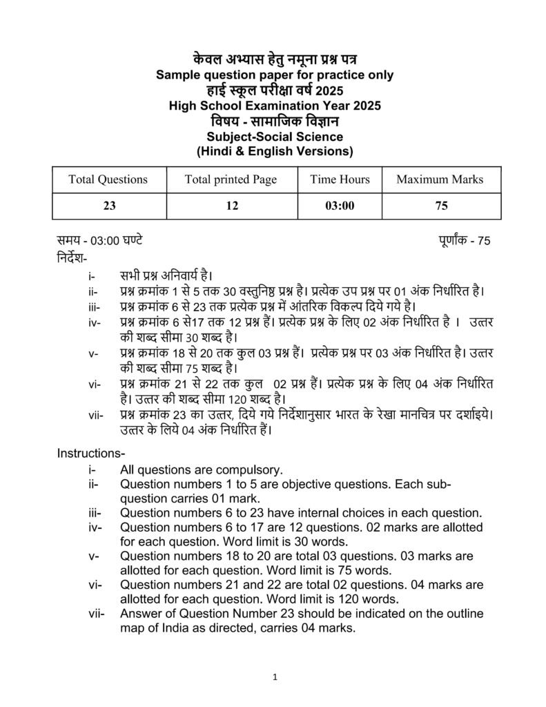 Social Science (300) (Practice Sample) question paper – 10th High School Examination-2025, Madhya Pradesh board of secondary education. सामाजिक विज्ञान (300) (अभ्यास नमूना) प्रश्न पत्र – 10 वीं, उच्च माध्यमिक परीक्षा – 2025, मध्य प्रदेश माध्यमिक शिक्षा मंडल।